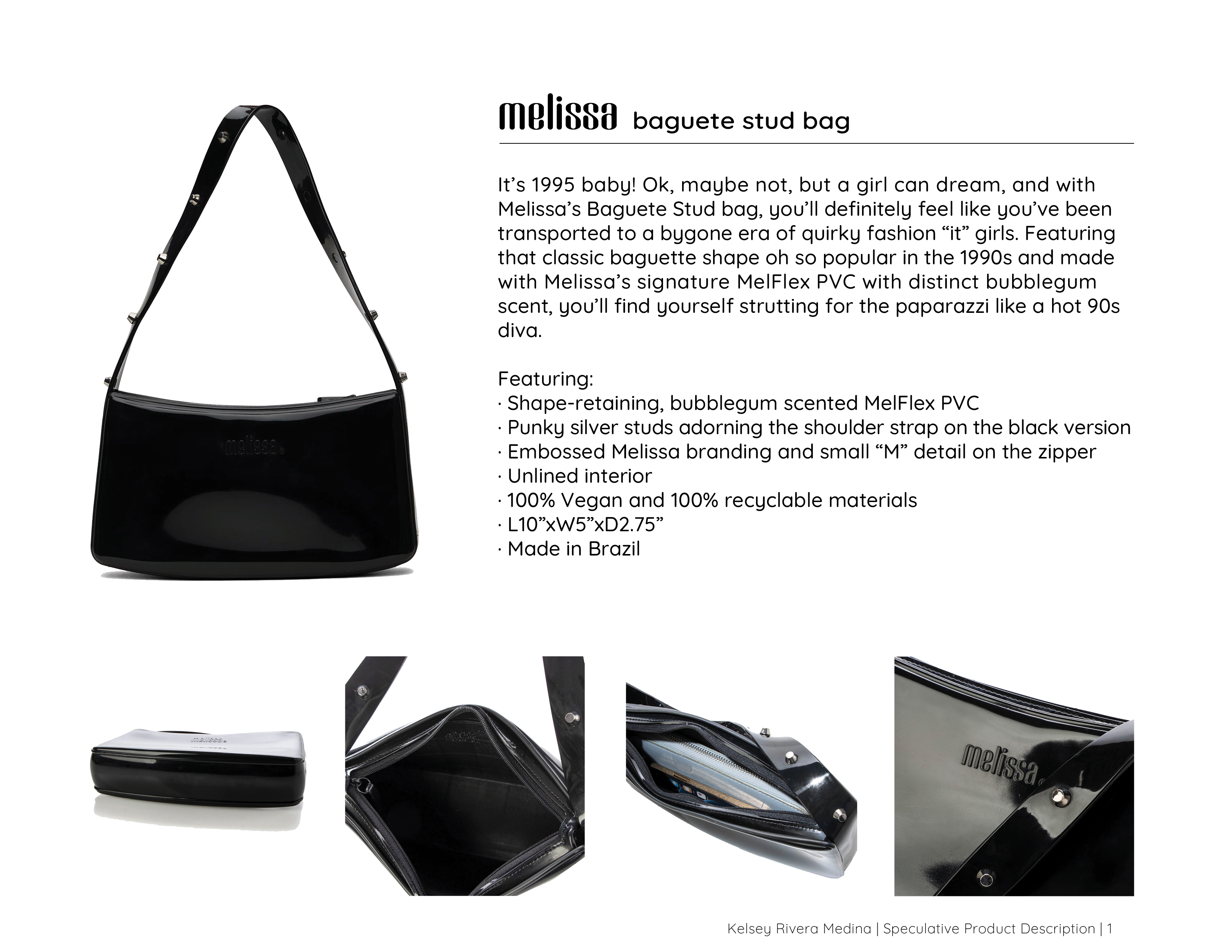 The first item is Melissa’s “baguete stud bag”, where I make reference to its 90s origins and include colourful language aimed towards Melissa’s core audience.