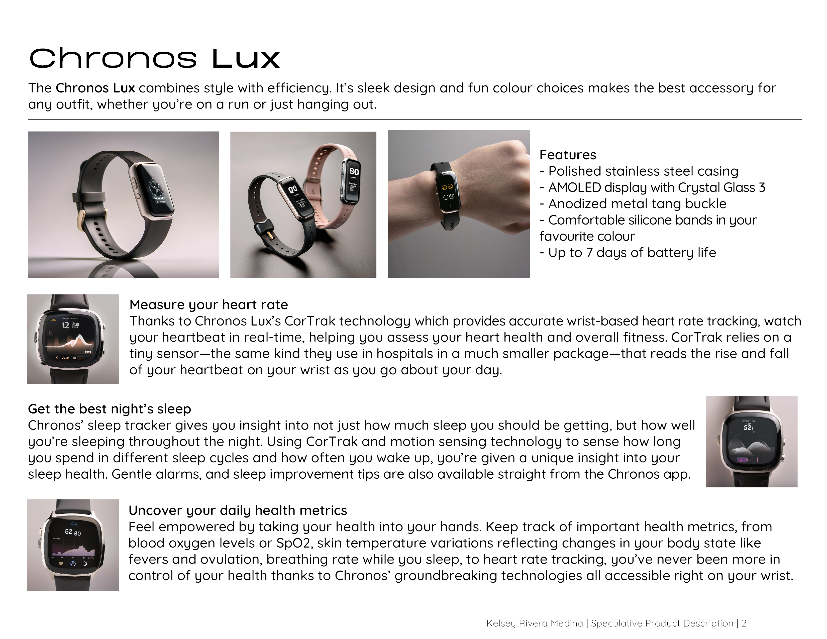 Next, I wrote a speculative product description for a fictional smartwatch brand called “Chronos” and their more fashion-forward model, “Lux”.